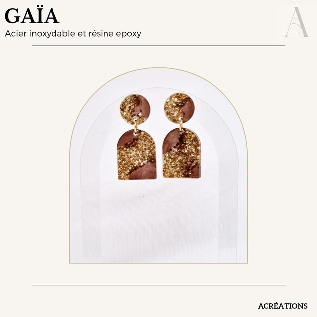 Boucles d’oreilles marron en résine époxy, ponctuées de paillettes dorées, montées sur acier inoxydable.