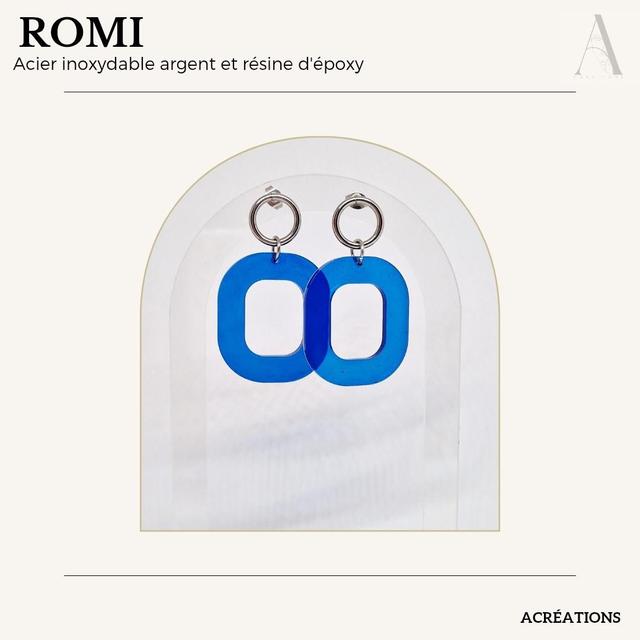 Boucles d’oreilles en acier inoxydable argenté et bleu électrique en résine époxy.